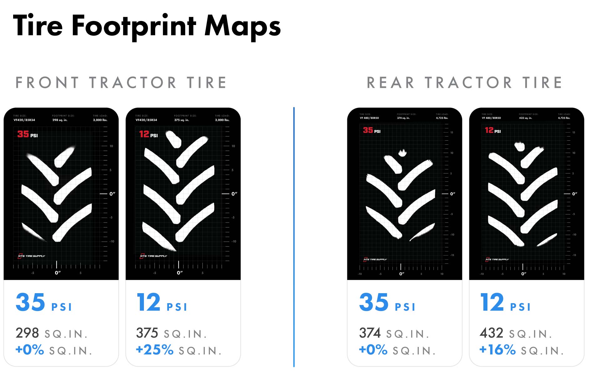 If your tractor’s standard radials (or bias-ply tires) won’t allow you to safely drop your tire pressure under 15 PSI in the field, you should look at an IF/VF tire upgrade.
